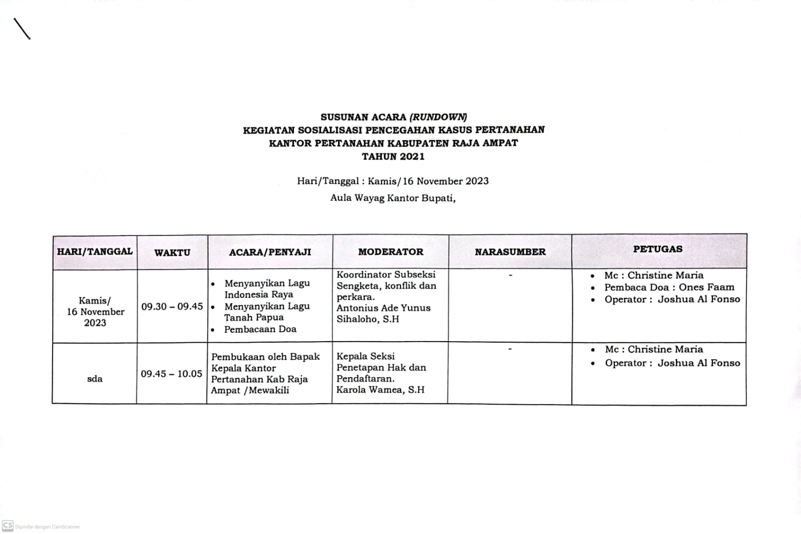 3 Sosialisasi Pencegahan Kasus Pertanahan 09:30 Aula Wayag, Kantor Bupati Asisten II, Kepala OPD Terkait Polres Raja Ampat dan BPN Raja Ampat BPN Raja Ampat -