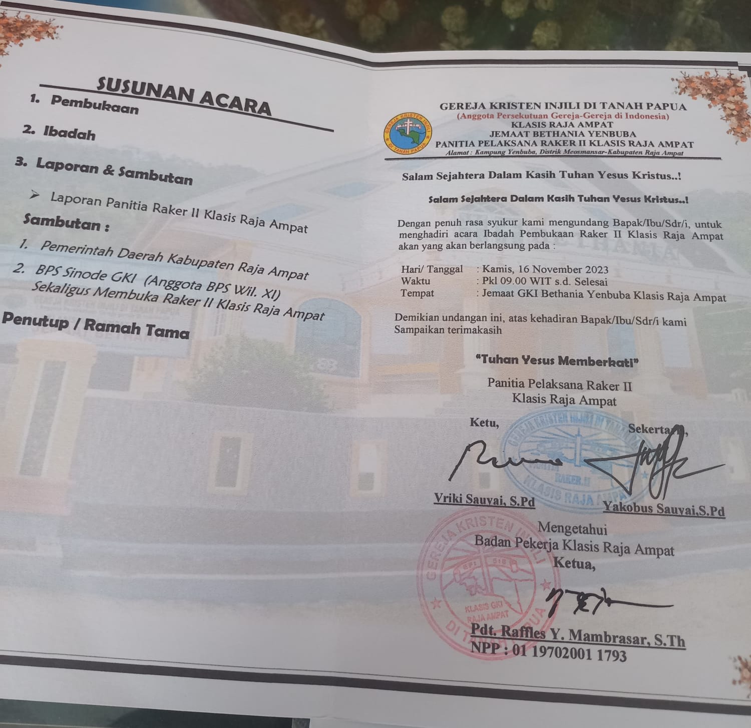 1 Pembukaan Raker II Klasis Raja Ampat 09:00 GKI Bethania Yenbuba Bupati, Wakil Bupati, Sekretaris Daerah - Panitia Penyelenggara -