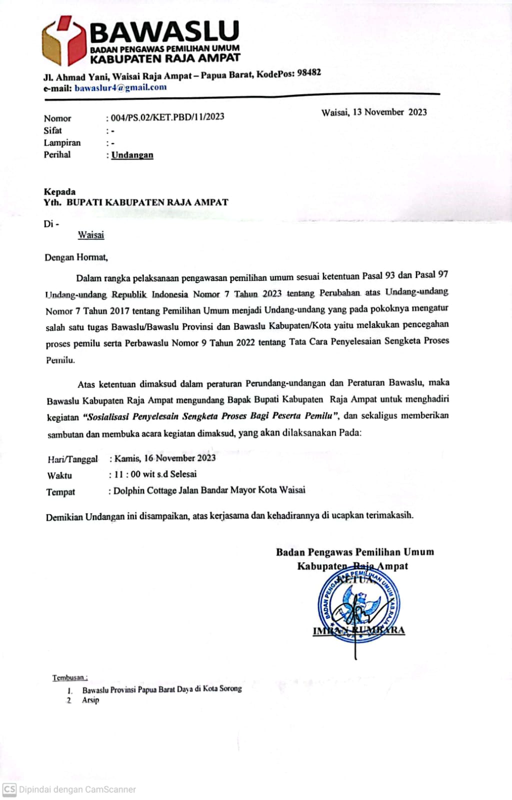 5 Sosialisasi Penyelesaian Sengketa Proses Bagi Peserta Pemilu 11:00 Dolphin Cottage, Waisai Bupati - BAWASLU Raja Ampat -