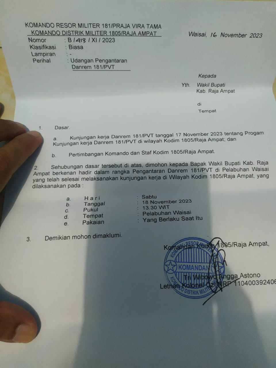 1 Pengantaran Kembali atas Kunker Danrem 181/PVT di Kabupaten Raja Ampat 13:30 Pelabuhan Waisai Bupati, Wakil Bupati Dandim, Kapolres Kodim 1805 Raja Ampat Pakaian : Yang Berlaku Saat Itu