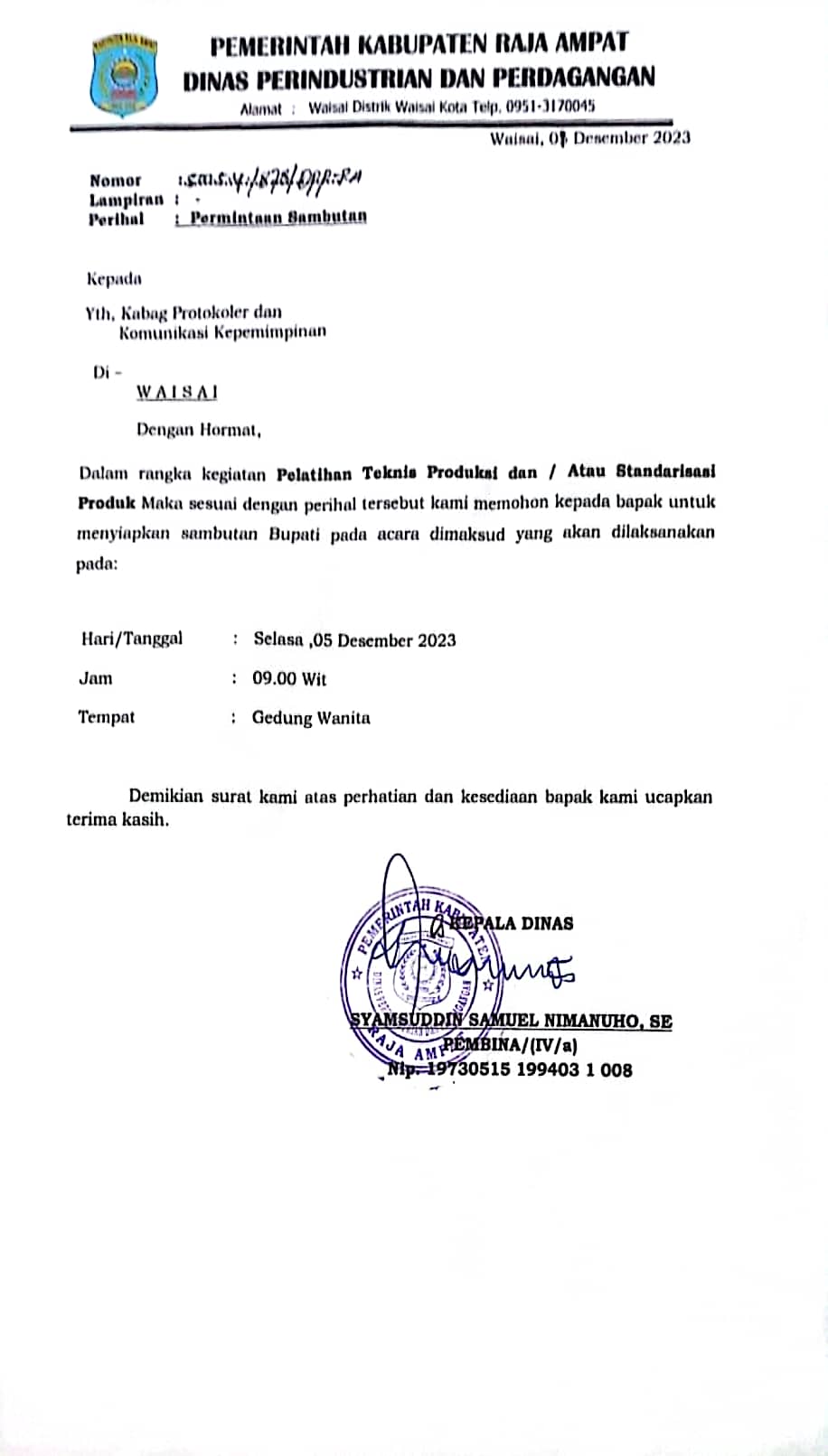 3 Kegiatan Pelatihan Teknis Produksi dan atau Standarisasi Produk 09:00 Gedung Wanita Syalome Syeben, Waisai Bupati - Dinas Perindag -