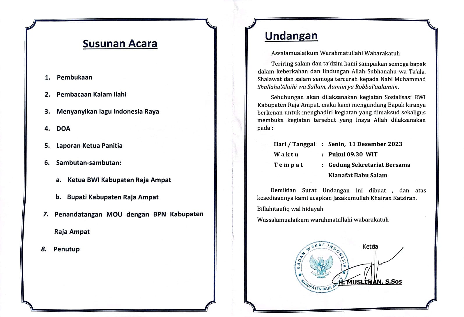 | 2 | Sosialisasi Badan Wakaf Indonesia Kabupaten Raja Ampat | 09:30 | Gedung Sekretariat Bersama Klanafat Babusalam | Bupati | - | Badan Wakaf Indonesia | - | |