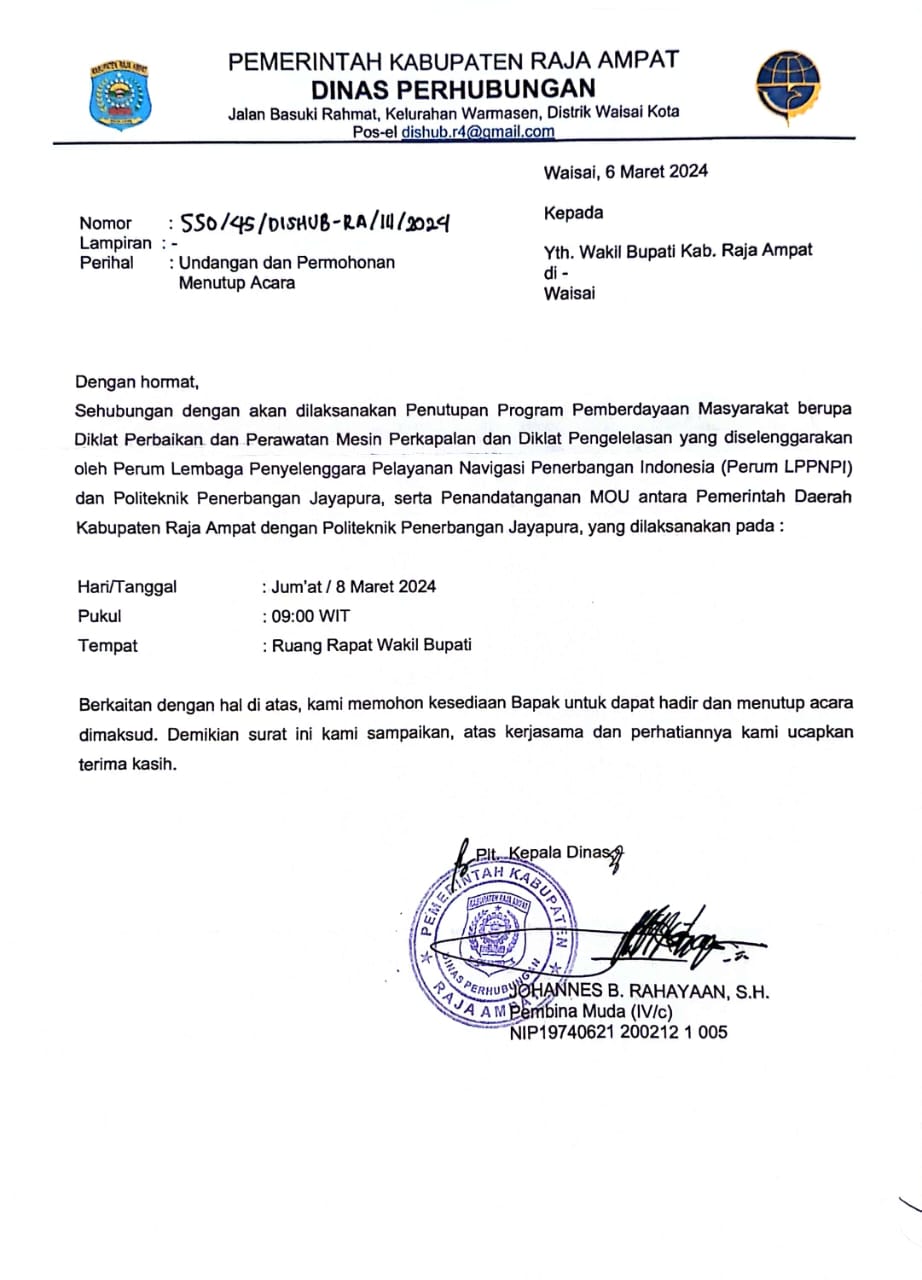 Penutupan Program Pemberdayaan Masyarakat berupa Diklat Perbaikan dan Perawatan Mesin Perkapalan dan Diklat Pengelelasan yang diselenggarakan Perum LPPNPI serta Penandatanganan MoU antara Pemerintah Daerah dengan Politeknik Penerbangan Jayapura |