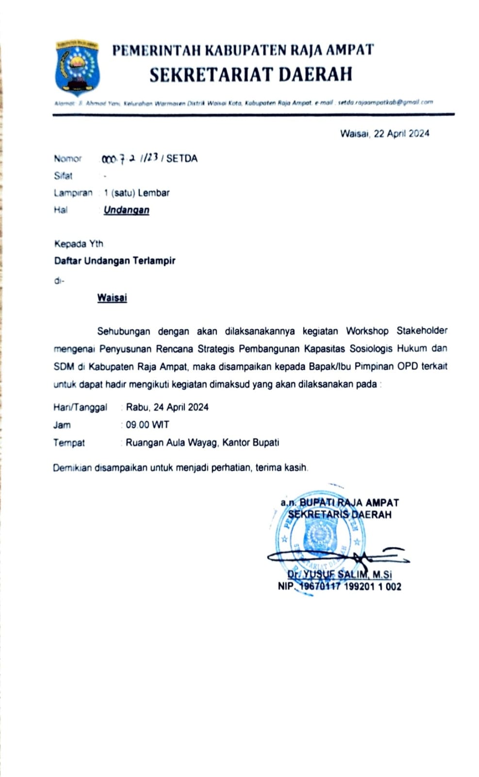 Workshop Stakeholder mengenai Penyusunan Rencana Strategi Pengembangan Kapasitas Sosiologis Hukum Dan SDM Kabupaten Raja Ampat |