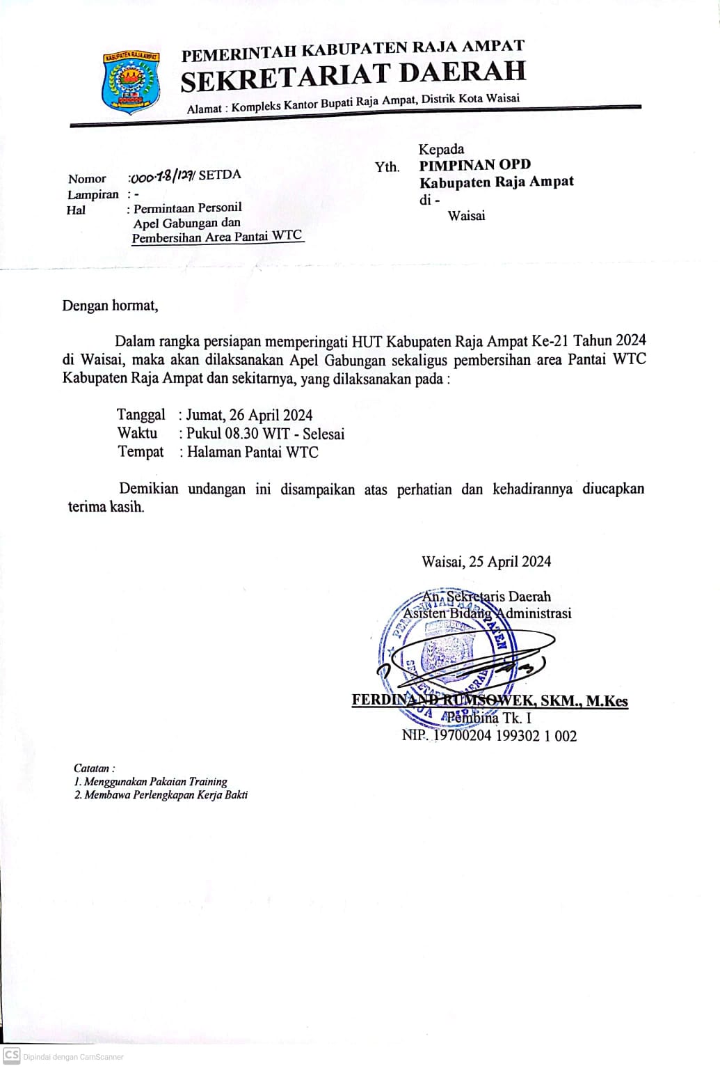 1 Apel Gabungan dilanjutkan Pembersihan Area Pantai WTC 08:30 Halaman Pantai WTC Seluruh ASN TNI/POLRI Panitia HUT Kabupaten ke 21 Pakaian : Olahraga, Membawa Alat Kerja Bakti