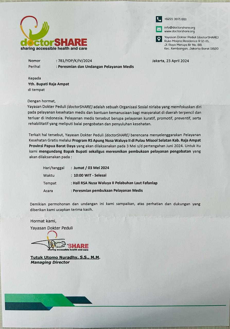 1 Peresmian dan Pembukaan Pelayanan Medis 10:00 Hall RSA Nusa Waluya II, Pelabuhan Laut Fafanlap Bupati - Doctor Share -