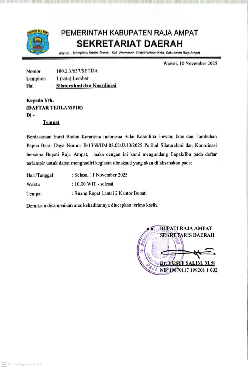 Silahturahmi dan Koordinasi Kepala Balai Karantina Hewan, Ikan dan Tumbuhan Papua Barat Daya bersama Bupati Raja Ampat |