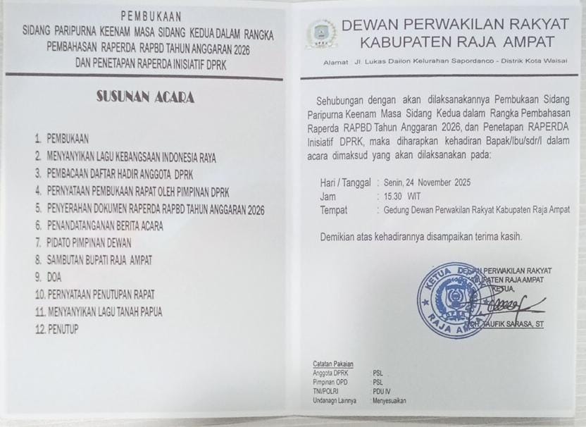 6 Pembukaan Sidang Paripurna Keenam Masa Sidang Kedua Dalam Rangka Pembahasan Raperda RAPBD Tahun Anggaran 2026 dan Penetapan Raperda Inisiatif DPRK 15:30 Gedung Dewan Perwakilan Rakyat Kabupaten Raja Ampat Bupati, Sekda, Kabag Prokopim - DPRK Raja Ampat Pakaian : Anggota DPRK/Pimpinan OPD (PSL), TNI/POLRI (PDUIV), Undangan Lain (Menyesuaikan)