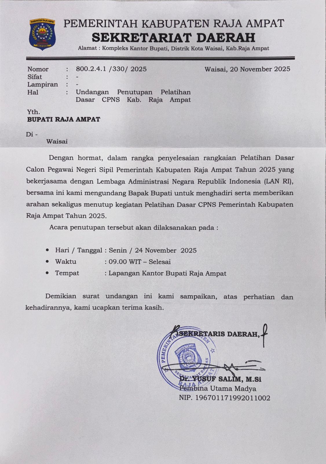 3 Undangan penutupan pelatihan dasar CPNS Kabupaten Raja Ampat 09:00 Lapangan kantor bupati Raja Ampat Bupati, Wakil Bupati - Pemerintah Kabupaten Raja Ampat -