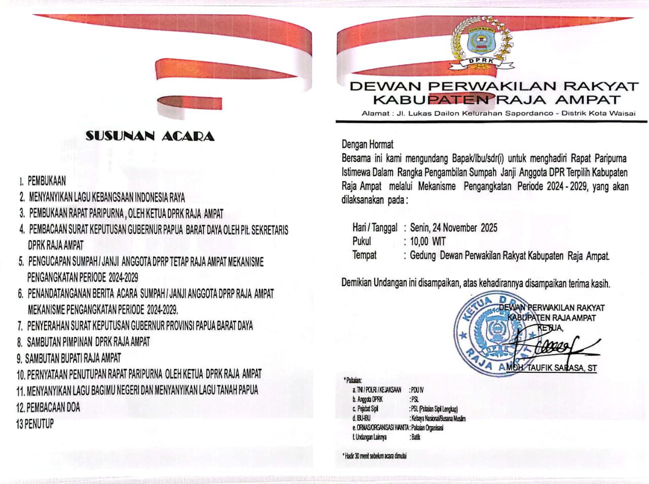 4 Rapat paripurna istimewa dalam rangka pengambilan sumpah/janji anggota Dewan Perwakilan Rakyat terpilih Kabupaten Raja Ampat melalui mekanisme pengangkatan periode 2024 -2029 10:00 Gedung Dewan Perwakilan Rakyat Kabupaten Raja Ampat Bupati, Wakil Bupati, Sekda, Asisten Sekda I, II dan III. - DPRK Kabupaten Raja Ampat -