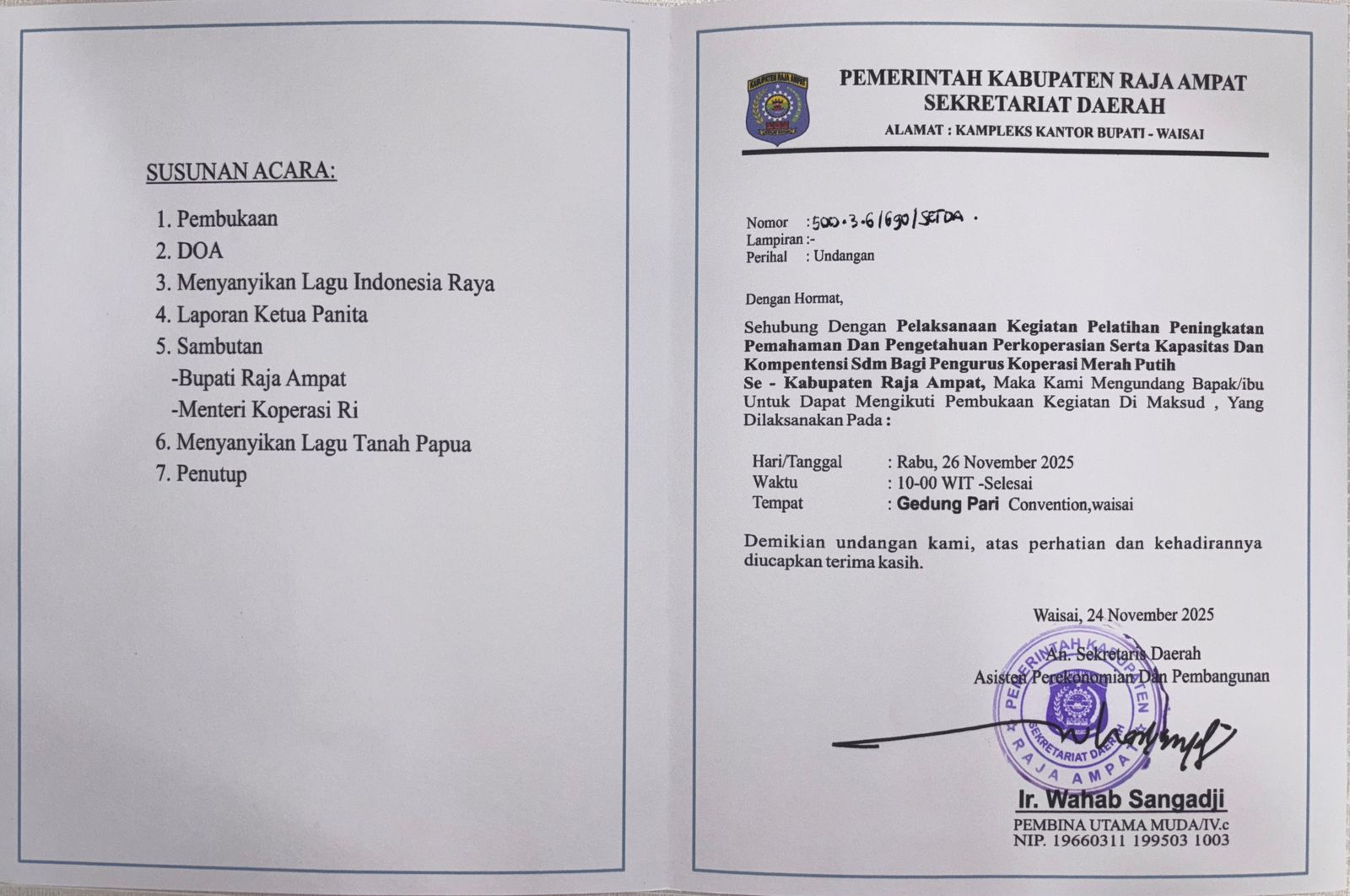 5 Pelaksanaan kegiatan pelatihan peningkatan pemahaman dan pengetahuan perkoperasian serta kapasitas dan kompetensi SDM Bagi pengurus koperasi merah putih se-kabupaten Raja Ampat 10:00 Gedung Pari Convention Center Waisai Bupati Raja Ampat, Kabag Prokopim - Pemerintah Kabupaten Raja Ampat -