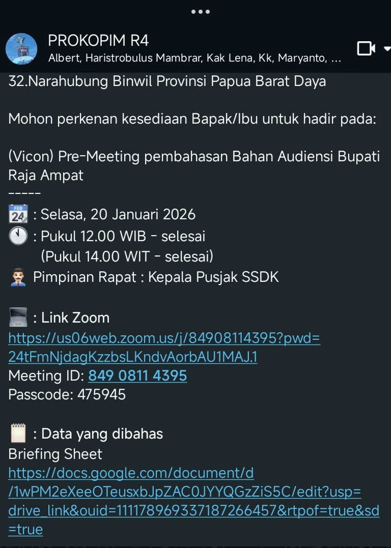 2 Vicon Pre-Meeting Pembahasan Bahan Audiensi Bupati Raja Ampat 14:00 Via Zoom (Meeting ID : 849 0811 4395), (Passcode : 475945) Ka Bappeda, Ka Dinkes, Ka Disdukcapil, Kabag Prokopim, Direktur UPTD RSUD, Ka Dinkes PBD, Ses Ditjen (Farmalkes, P2, Kesprimkom) BKPK Kemenkes RI Mohon untuk data yang diperlukan dalam link bahan tersebut untuk dilengkapi sebelum pre-meeting dimulai