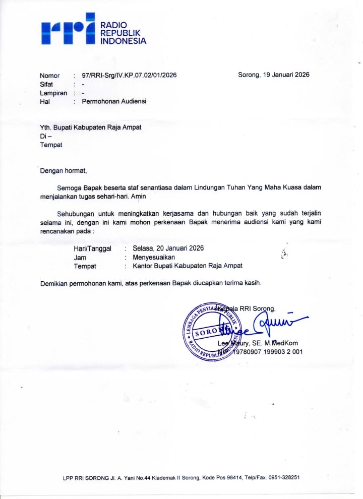 1 Audiensi dengan RRI Sorong 08:00 Kantor Bupati Raja Ampat Bupati Raja Ampat - RRI Sorong -