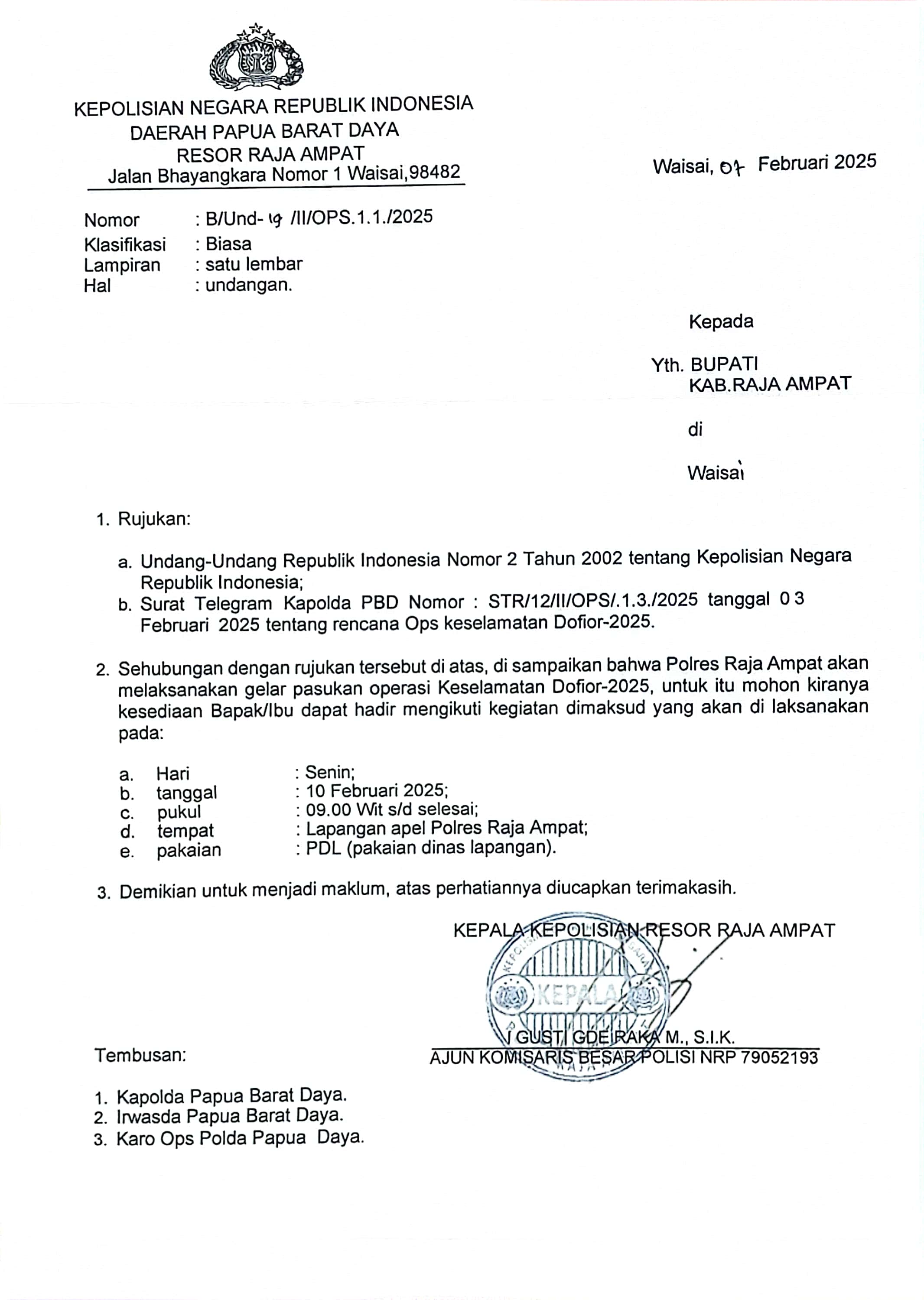 3 Gelar Pasukan Operasi Keselamatan Dofior 2025 09:00 Lapangan Apel Mapolres Raja Ampat Bupati - Polres Raja Ampat -