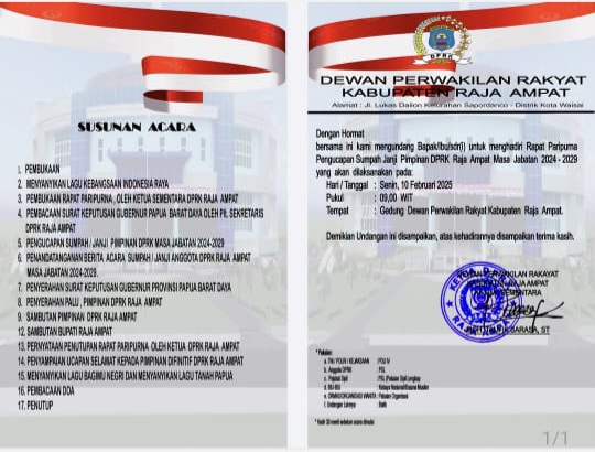4 Rapat Paripurna Pengucapan Sumpah/Janji Pimpinan DPRK Raja Ampat masa jabatan 2024-2029 09:00 Gedung DPRK Raja Ampat Bupati, Wakil Bupati, Sekda, Staf Ahli Bupati, Asisten SETDA, Kepala OPD, Kepala Bagian SETDA Forkopimda Raja Ampat DPRK Raja Ampat Pejabat Sipil : PSL