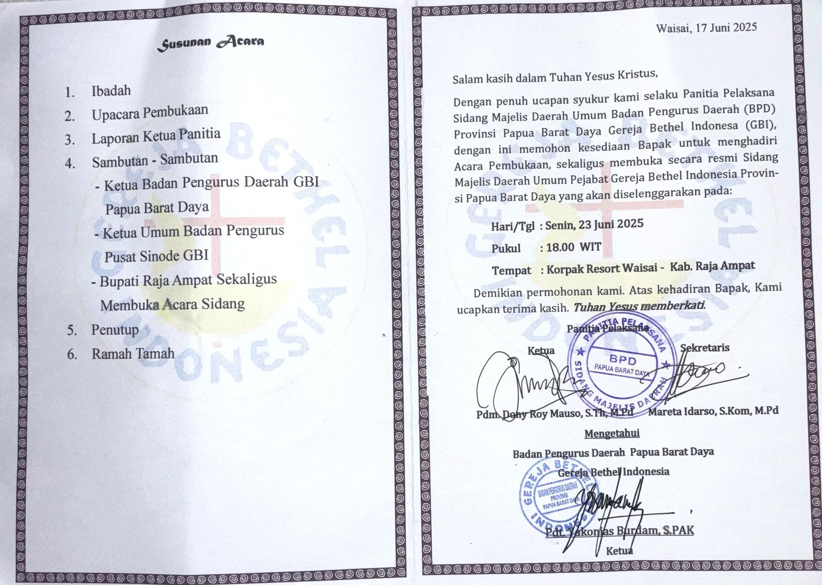 Pembukaan Sidang Majelis Daerah Umum Pejabat Daerah Bethel Indonesia Provinsi Papua Barat Daya |