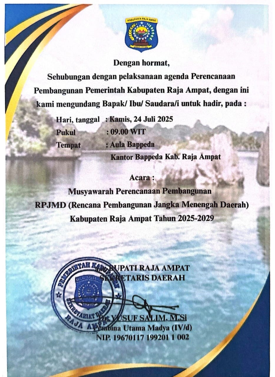 1 Musyawarah Rencana Pembangunan Jangka Menengah Daerah (RPJMD) Kabupaten Raja Ampat Tahun 2025-2029 09:00 Aula BP4D Bupati, Wakil Bupati, Sekda, Staf Ahli Bupati, Asisten SETDA, Kepala OPD, Kepala Bagian SETDA Forkopimda BP4D -