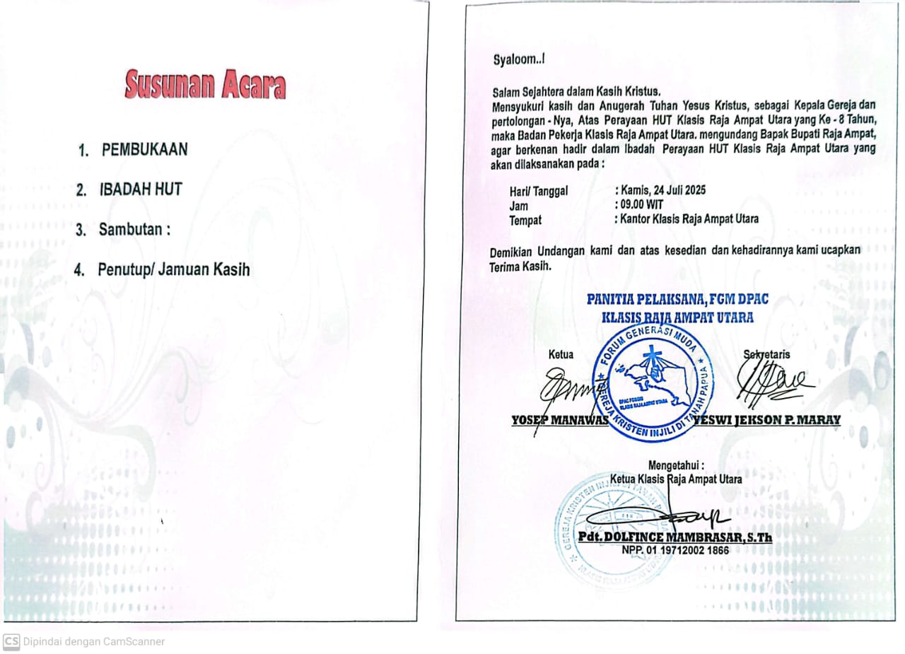 2 Ibadah Perayaan HUT Klasis Raja Ampat Utara yang Ke 8 Tahun 09:00 Kantor Klasis Raja Ampat Utara Bupati - Panitia Pelaksana -