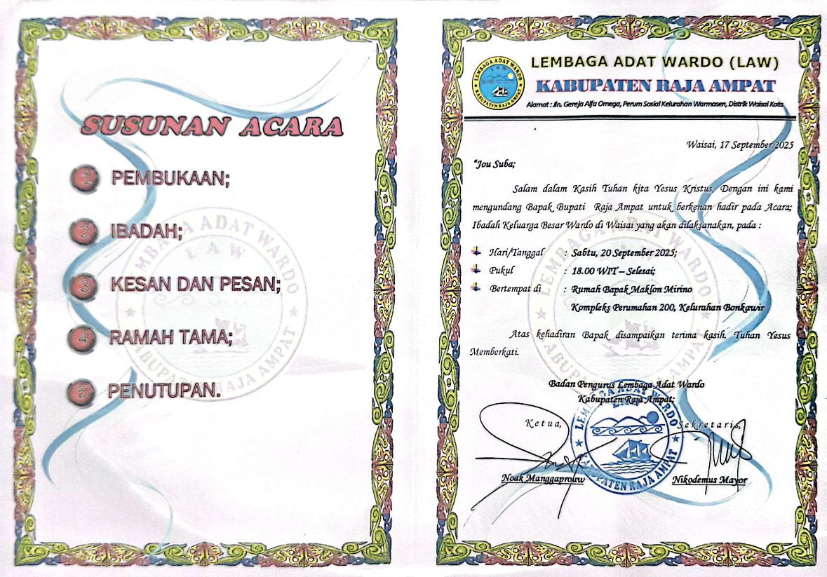 2 Ibadah Keluarga Besar Wardo Tahun 2025 18:00 Rumah Bapak Marlon Mirino, Komplek Perumahan 200, Kelurahan Bonkawir Bupati Raja Ampat - Lembaga Adat Wardo (LAW) Kab. Raja Ampat -