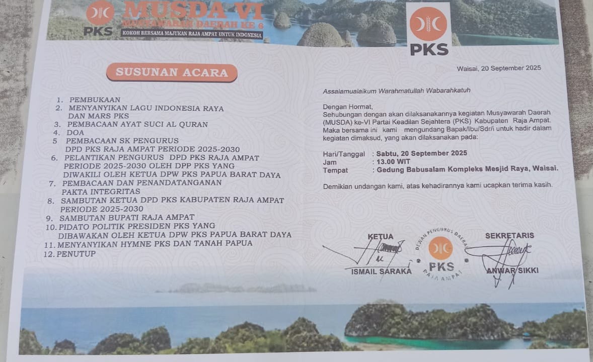 1 Musda VI Partai Keadilan Sejahtera (PKS) Kab. Raja Ampat 13:00 Gedung Babussalam Komplek Masjid Raya Waisai Bupati Raja Ampat - Partai PKS Kab. Raja Ampat -
