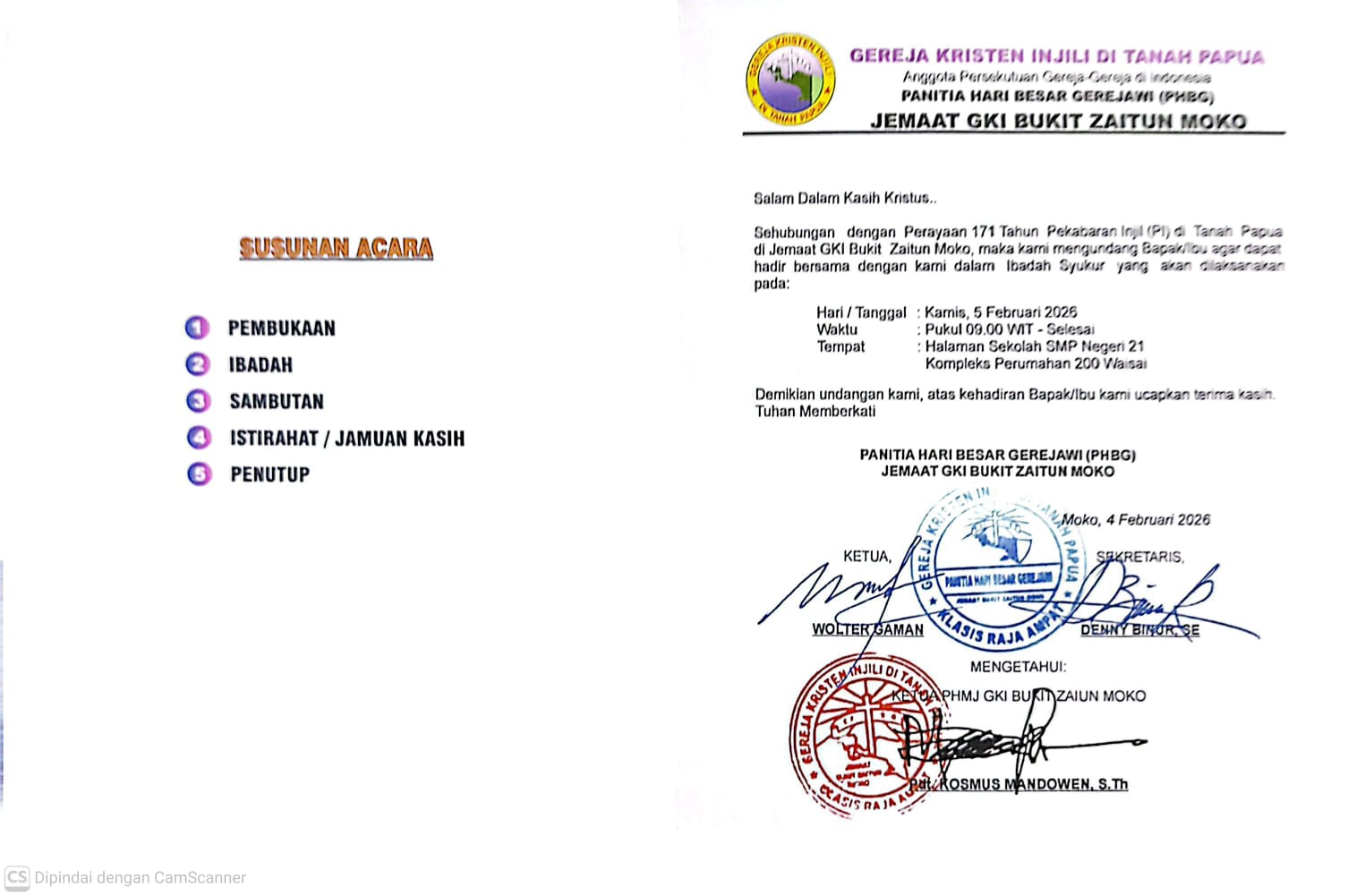 1 Ibadah Syukur 171 Tahun Pekabaran Injil di Tanah Papua Jemaat GKI Bukit Zaitun Moko 09:00 Halaman Sekolah SMP 21, Kompleks Perumahan 200, Waisai Bupati dan Wakil Bupati - Jemaat GKI Bukit Zaitun Moko -