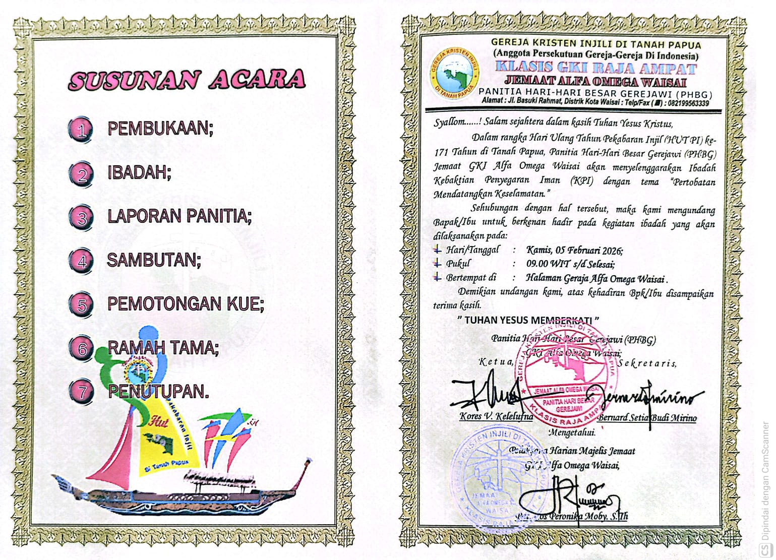 2 Ibadah Perayaan HUT Pekabaran Injil Ke-171 Tahun di Tanah Papua 09:00 Halaman Gereja Alfa Omega Waisai Bupati dan Wakil Bupati - Jemaat Alfa Omega Waisai -