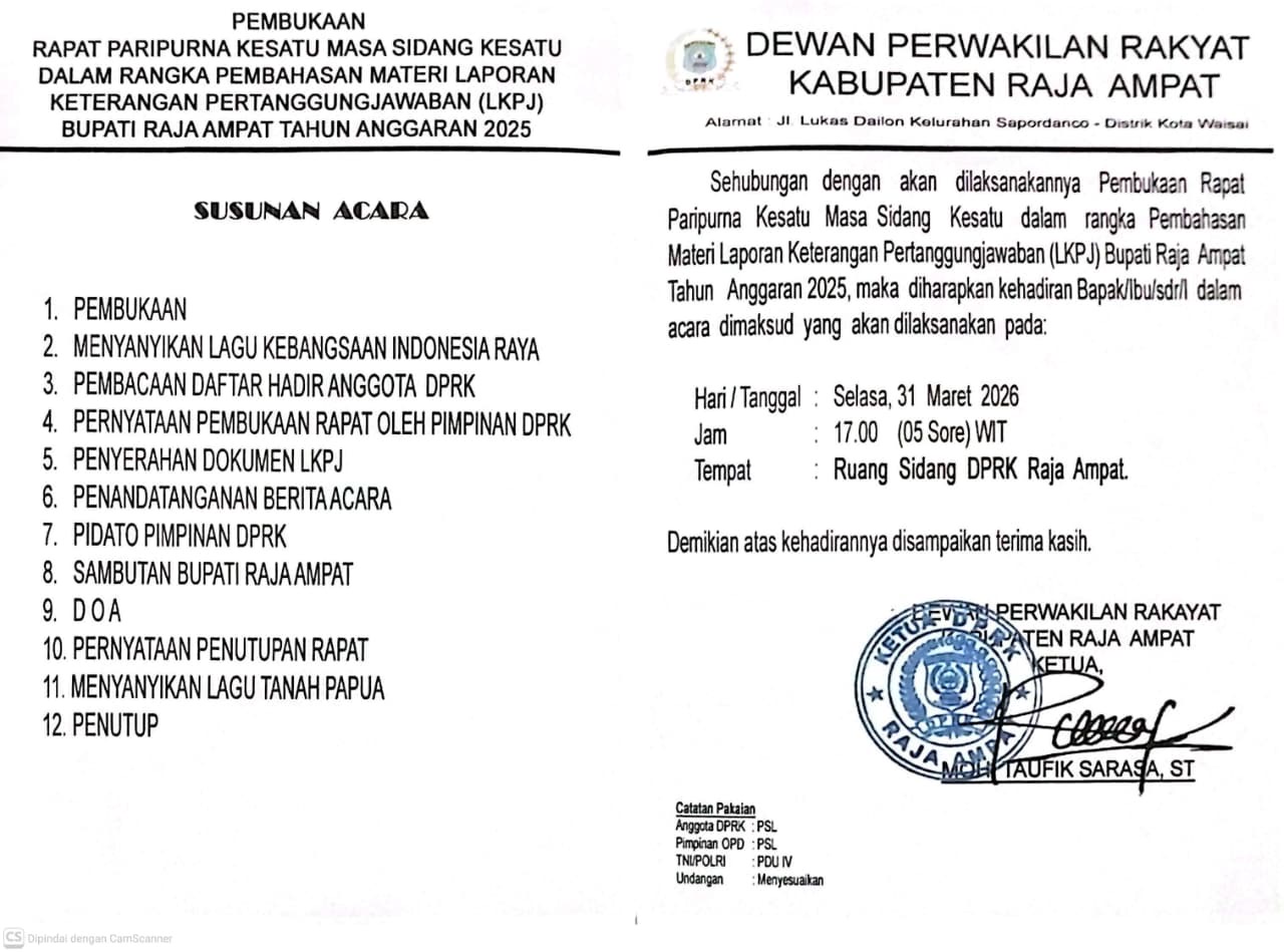 Pembukaan Rapat Paripurna Kesatu Masa Sidang Kesatu dalam Rangka Pembahasan Materi Laporan Pertanggung Jawaban (LKPJ) Bupati Raja Ampat Tahun Anggaran 2025 |