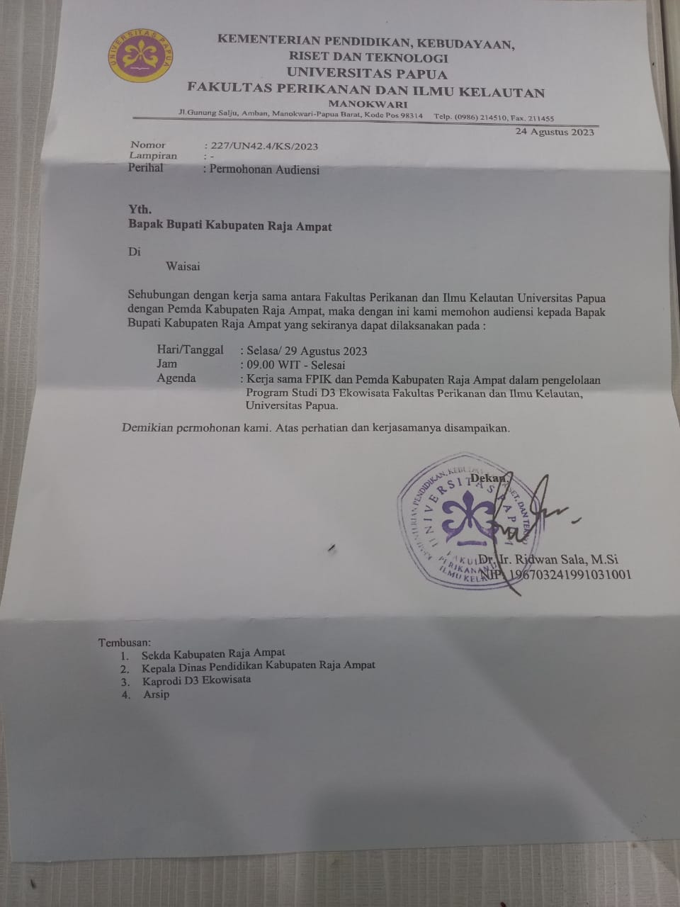 Audiensi Pemda Kabupaten Raja Ampat dengan Universitas Papua sehubung dengan Kerja Sama antara Fakultas Perikanan dan Ilmu Kelautan |