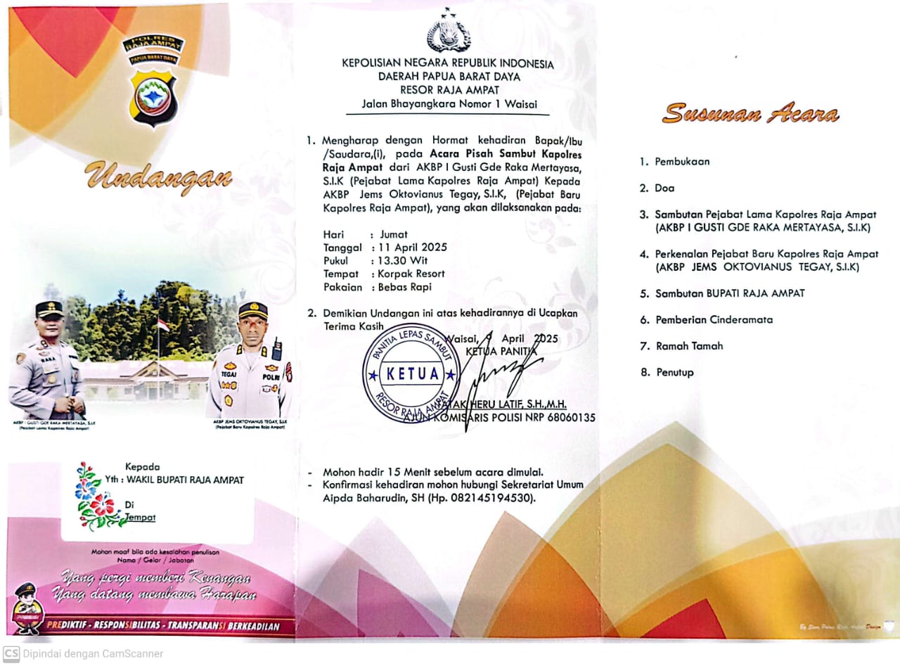 Acara Pisah Sambut Kapolres Raja Ampat dari AKBP I Gusti Gde Raka Mertayasa, S.I.K kepada AKBP Jems Oktovianus Tegay, S.I.K |