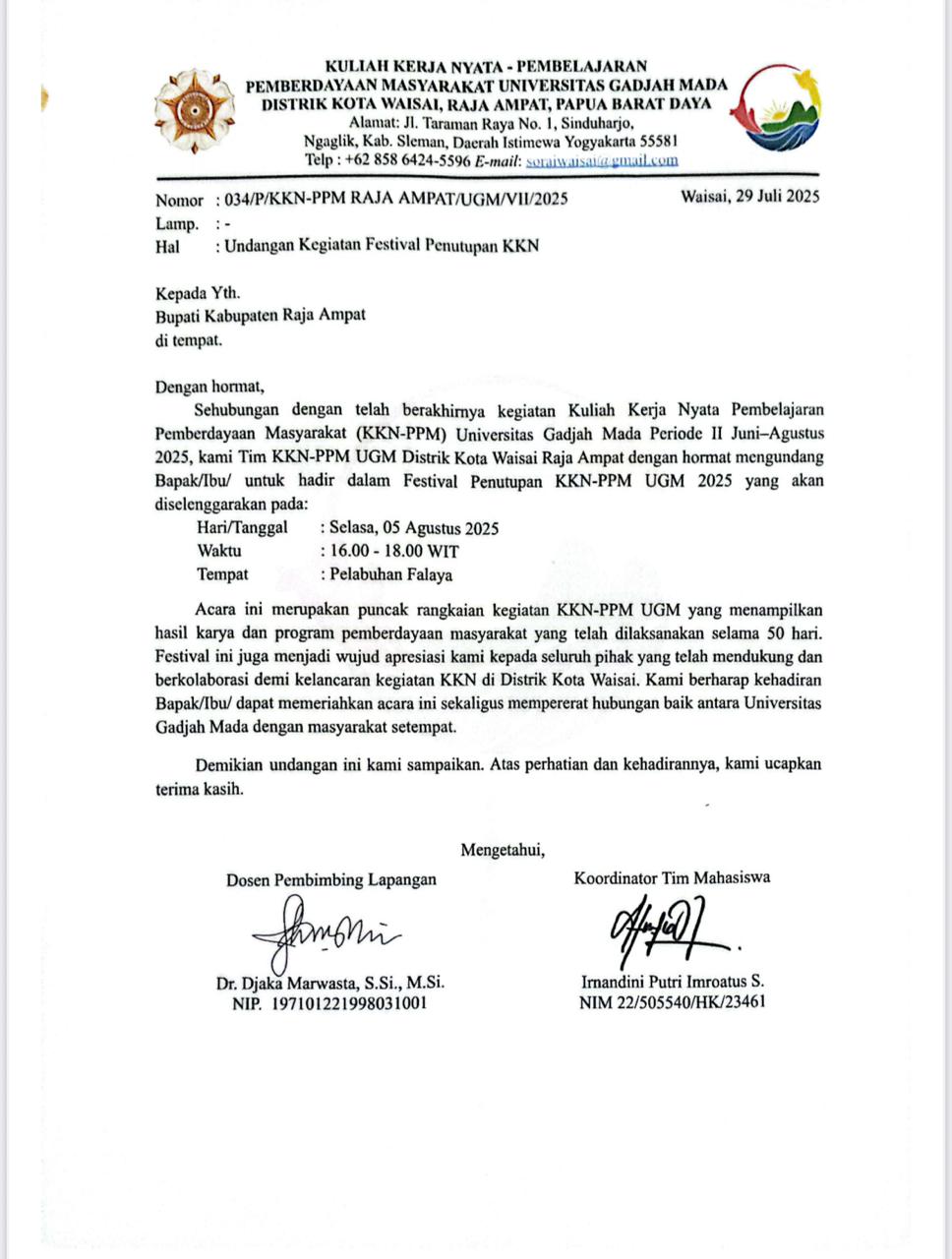 4 Penutupan Kegiatan Festival KKN-PPM UGM 16:00 Pelabuhan Falaya Bupati, Wakil Bupati dan Sekda - Mahasiswa KKN-PPM UGM -