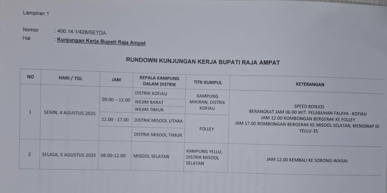 2 Kunjungan Kerja Bupati Raja Ampat di Kampung-Kampung Se-Kabupaten Raja Ampat 09:00 Kampung Yellu, Distrik Misool Selatan Bupati, Wakil Bupati, Sekda, OPD dan Bagian Terkait Forkopimda Raja Ampat Pemda Raja Ampat -